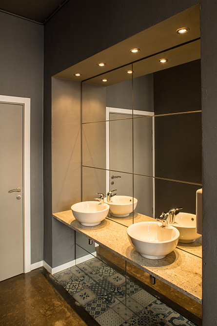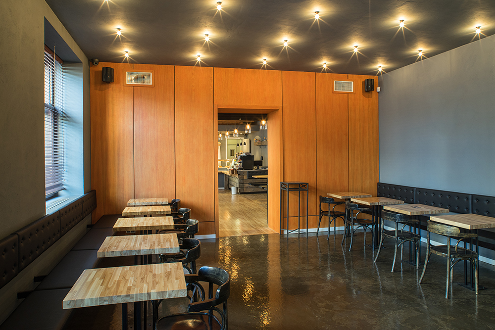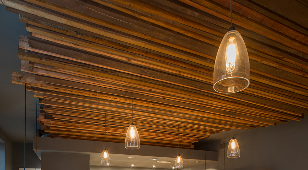 Renovation project of a cafeteria style restaurant. Clients intended to have wooden slats, thus creating a kind of false wooden ceiling.